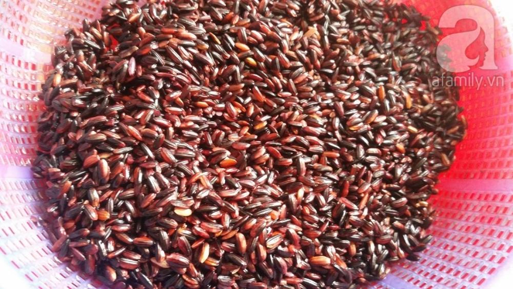 Gạo nếp cẩm vo sạch, ngâm với nước từ 4 đến 6 tiếng, rồi cho ra để ráo nước.