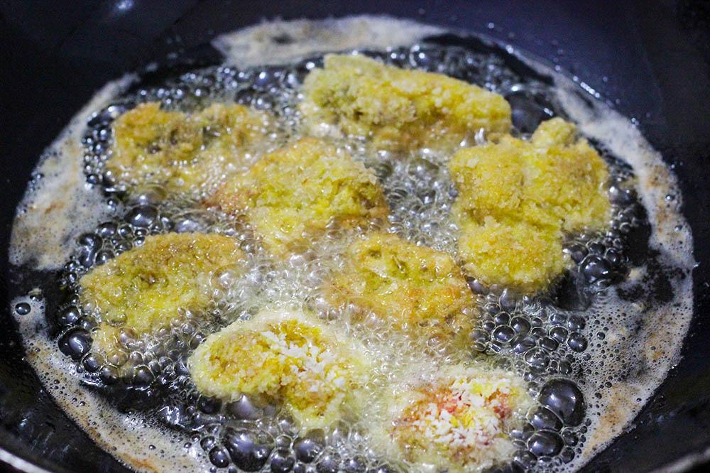 Sau đó, nhúng sườn vào bát trứng đánh tan rồi lăn sườn qua bột chiên xù.