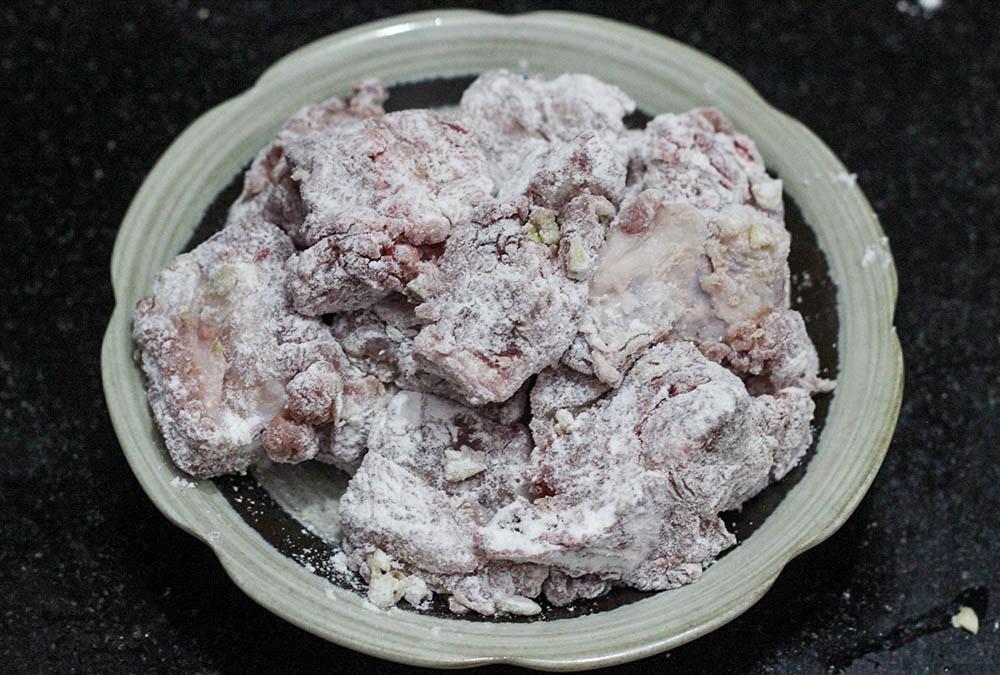 Lăn từng miếng sườn qua bột mì sao cho bột mì bám đều hết miếng sườn.