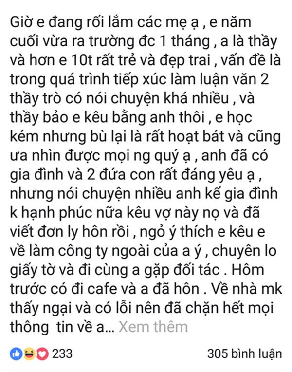 “Giờ em đang rối lắm các mẹ ạ. Em năm cuối vừa ra trường được một tháng. Anh là thầy và hơn em 10 tuổi, rất trẻ và đẹp trai. Vấn đề là trong quá trình tiếp xúc làm luận văn, hai thầy trò có nói chuyện khá nhiều, và thầy bảo em kêu bằng anh thôi. Em học kém nhưng bù lại rất hoạt bát và cũng ưa nhìn, được mọi người quý ạ. Anh đã có gia đình và hai đứa con rất đáng yêu. Nhưng nói chuyện nhiều anh kể gia đình không hạnh phúc nữa, kêu vợ này nọ và đã viết đơn ly hôn rồi. Anh ngỏ ý thích em, kêu em về làm công ty ngoài của anh ý, chuyên lo giấy tờ và cùng anh đi gặp đối tác.