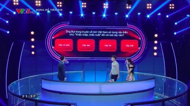 Với chủ đề "Ông Bụt" trong game show Đừng để tiền rơi số 98, Sỹ Luân và Phương Thảo nhận được câu hỏi: "Ông Bụt trong truyện cổ tích Việt Nam sử dụng câu thần chú 'Khắc xuất, khắc nhập' đối với loài cây nào?" và 4 đáp án: cây vú sữa, cây tre, cây cau và cây khế.