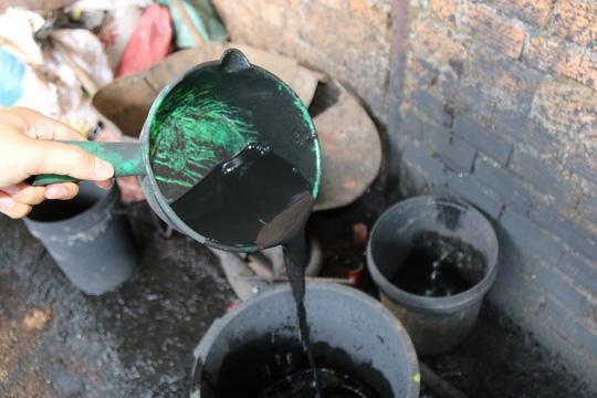 Chậu chứa các cục pin đập nát để lấy bột mang đi nhuộm cà phê.