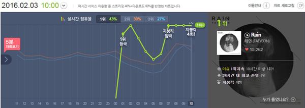 Ngay sau khí phát hành, ca khúc Rain đã một lần nữa đánh sập mọi bảng xếp hạng âm nhạc tại Hàn Quốc. Chỉ sau 30 phút, "Rain" đã đứng đầu mọi bảng xếp hạng lớn như Naver, Melon, Genie,...và sau 3 tiếng đồng hồ, "Rain" đã All-kill toàn bộ các bảng xếp hạng lớn nhỏ.