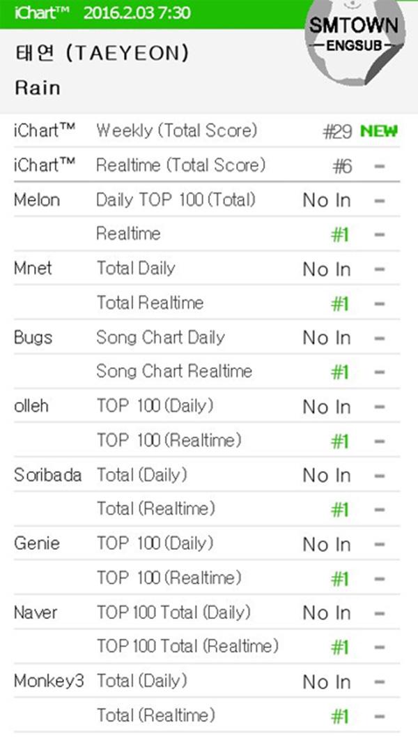 Vào đêm 3/2, Taeyeon đã phát hành ca khúc mới "Rain", đây là digital single nằm trong dự án mới nhất của SM, dự án mỗi tuần sẽ phát hành một ca khúc mới. Rain là một ca khúc với nhịp điệu jazz trung bình, gợi cảm hứng về một chuyện tình đã qua cùng cơn mưa. Giọng hát quyến rũ của cô nàng trưởng nhóm SNSD Taeyeon vẫn khiến không ít khán giả ngây ngất.