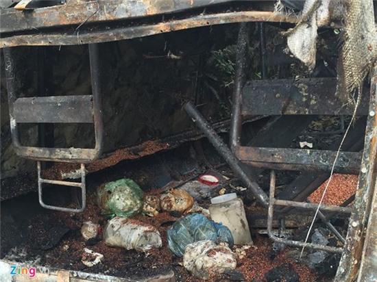 | Trưa 15/3, chiếc xe khách bốc cháy trên đèo Thung Khe vẫn chưa được rời khỏi hiện trường. Trong xe nhiều đồ đạc, hành lý của các nạn nhân bị cháy xém. Ảnh: Hoàn Nguyễn. |