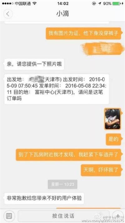 Theo thông tin mới cập nhật từ trang Shanghaiist, vào ngày 9/5 một hành khách nữ đã gọi taxi bằng ứng dụng Didi, khi cô vừa ổn định chỗ ngồi thì hốt hoảng phát hiện tài xế xe không hề mặc quần. Trang phục anh ta mặc chỉ là chiếc áo thể thao, chiếc quần đùi được sử dụng để che riêng chỗ kín.