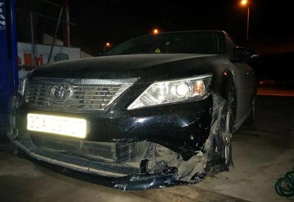 Xe Camry vỡ phần đầu nơi chiếc xe máy bị mắc kẹt. Ảnh: B.T.