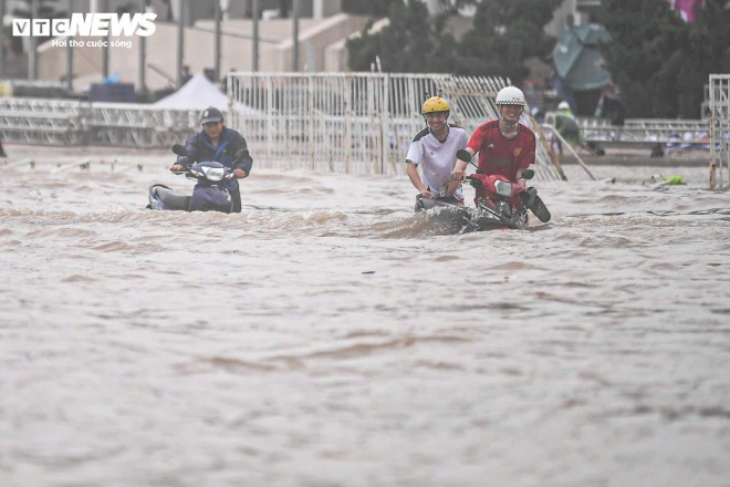 Sau hơn 3 tiếng mưa lớn do chịu ảnh hưởng hoàn lưu bão Matmo, khu vực đường tàu Cổ Nhuế ngập sâu, các phương tiện khó có thể di chuyển.