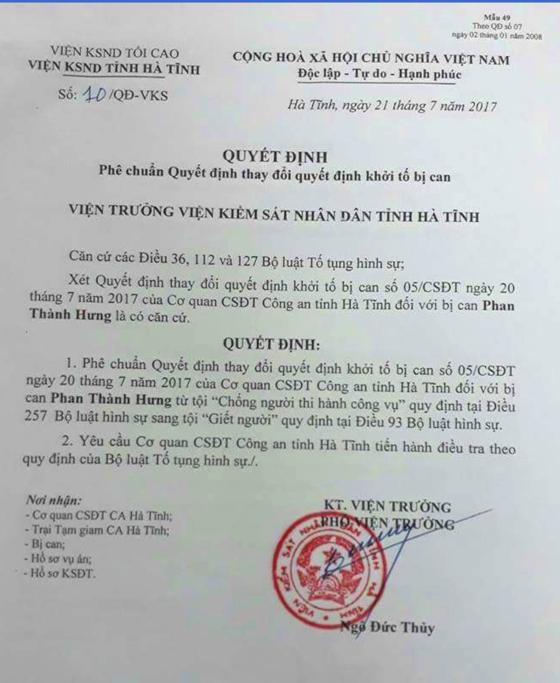 Sáng 22-7, tin từ Cơ quan Công an tỉnh Hà Tĩnh cho biết, ngày 21-7, Viện Kiểm sát Nhân dân tỉnh Hà Tĩnh đã ký quyết định số 10/QĐ-VKS phê chuẩn quyết định thay đổi quyết định khởi tố bị can số 05/CSĐT ngày 20-7-2017 của Cơ quan Cảnh sát điều tra Công an tỉnh Hà Tĩnh đối với bị can Phan Thành Hưng (22 tuổi, trú tại xóm Đại Thuận, xã Mỹ Hiệp, huyện Phù Mỹ, tỉnh Bình Định) từ tội chống người thi hành công vụ quy định tại Điều 257 Bộ luật hình sự sang tội giết người quy định tại Điều 93 Bộ luật hình sự.