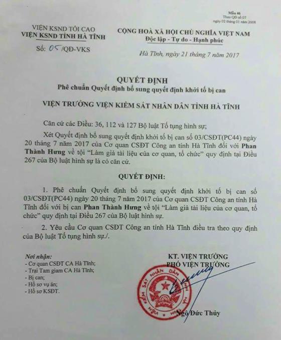 Đồng thời, Viện Kiểm sát Nhân dân tỉnh Hà Tĩnh cũng ký quyết định số 05/QĐ-VKS phê chuẩn quyết định bổ sung quyết định khởi tố bị can số 03/CSĐT (PC44) ngày 20-7-2017 của Cơ quan Cảnh sát điều tra Công an tỉnh Hà Tĩnh đối với bị can Phan Thành Hưng về tội làm giả tài liệu của cơ quan, tổ chức quy định tại Điều 267 của Bộ luật hình sự.