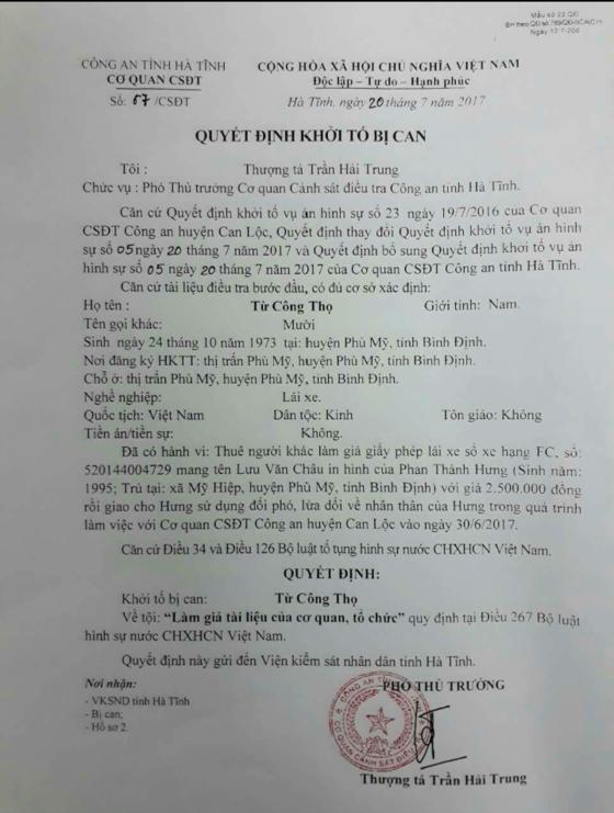 Liên quan đến việc tài xế Phan Thành Hưng làm giả tài liệu của cơ quan, tổ chức, ngày 20-7-2017, Cơ quan Cảnh sát điều tra Công an tỉnh Hà Tĩnh còn ra quyết định số 67/CSĐT, quyết định khởi tố thêm bị can Từ Công Thọ (44 tuổi, trú tại thị trấn Phù Mỹ, huyện Phù Mỹ, tỉnh Bình Định) về tội làm giả tài liệu của cơ quan, tổ chức quy định tại Điều 267 Bộ luật hình sự.