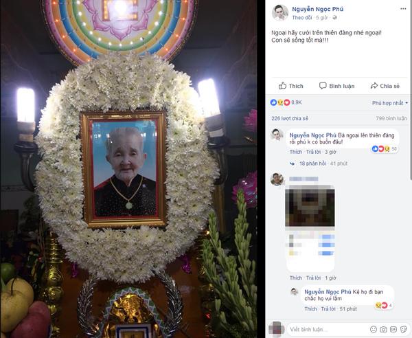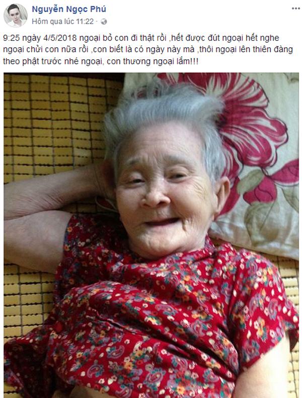 Với Phú, cậu luôn ước ao bà sẽ sống thật lâu bên cậu và những người thân yêu. Những dòng chia sẻ của Phú trong những ngày bà đau yếu, khiến nhiều người không khỏi rơi nước mắt: 'Ngoại ơi con thương ngoại lắm, ráng khoẻ lại nhé. Con muốn ngoại khoẻ, ngoại chửi con, ngoại đánh con, phun cháo vào mặt con thì con vẫn sẽ cười. Con buồn quá nhìn ngoại sức khoẻ yếu đi con đau lòng lắm. Con muốn khóc lắm nhưng nước mắt con nó cứ chảy ngược vào trong. Lúc nào con củng tự an ủi là ngoại không sao.