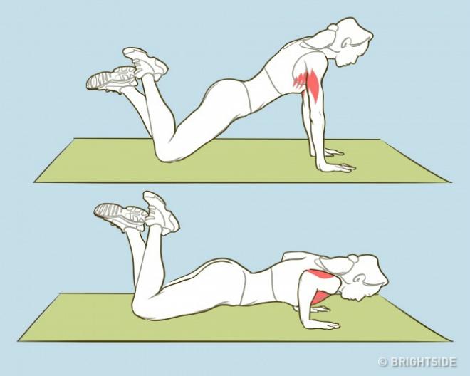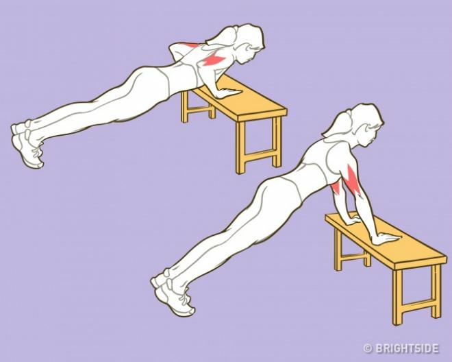Vẫn là một bài tập thể dục tác động lực trọn vẹn vào bắp tay sau, chống đẩy với ghế băng sẽ quen thuộc với con gái chúng mình hơn một chút so với động tác chống đẩy ngược ở trên và dễ dàng thực hiện hơn so với động tác chống đẩy với mặt sàn thông thường.