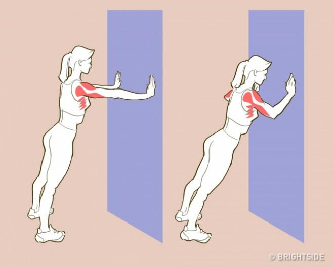 Bắt đầu với chân dang rộng bằng vai, người thẳng đứng rồi từ từ duỗi hai tay với lòng bàn tay chạm vào tường sao cho người nghiêng một độ vừa phải. Gập khuỷu tay lại và đưa sát người vào tường sao cho tư thế của bạn vẫn thẳng. Thở ra khi đẩy người ra xa tường và hít vào trong quá trình còn lại.