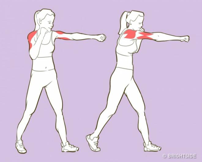 Đây là một bài tập khởi động quen thuộc trong môn đấm bốc hay quyền anh giúp các cô gái ‘củng cố’ cơ vai và bắp tay.