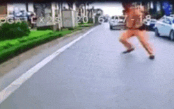 Theo clip, người mặc trang phục CSGT chạy từ vỉa hè, lao ra giữa đường chặn bắt nhóm đi xe máy. Sau khi người này giơ chân lên, chiếc xe mất lái, đâm vào dải phân cách cứng rồi trượt trên mặt đường. 2 thanh niên trên xe máy văng lên phần đất nằm giữa dải phân cách, gần đó là tủ điện.