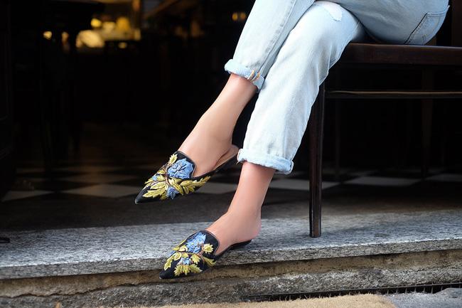 Những đôi dép bệt bít kín mũi khi đi theo xu hướng embellishment - đồ thêu họa tiết/ đính kết phụ kiện, được đính sequin, phủ metallic, đính đá bỗng trở nên sang chảnh hơn bao giờ hết. Một đôi dép cầu kỳ, hút mắt thế này sẽ đẹp nhất khi kết hợp set đồ có tông trung tính, ít họa tiết, giúp tổng thể set đồ hài hòa hơn.