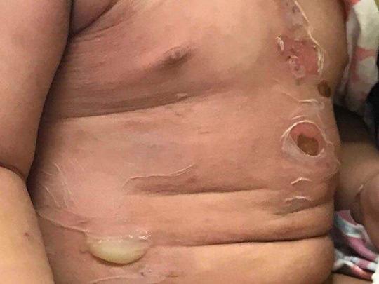 Bệnh viện sản nhi Quảng Ninh ngày 20-6 cho biết vừa tiếp nhận bé Hoàng Nhật L. (2 tuổi, dân tộc Tày, ngụ ở tỉnh Bắc Giang) trong tình trạng toàn thân lở loét với nhiều mảng da sưng phồng khiến trẻ đau đớn.