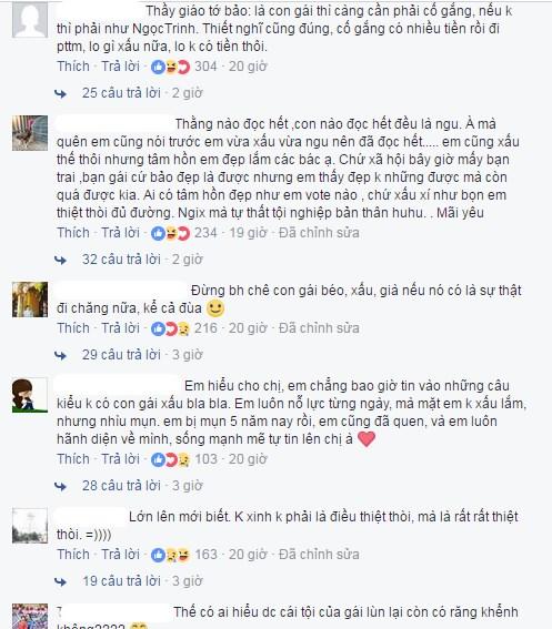 Kèm theo đó là những lời động viên: "Em hiểu cho chị, em chẳng bao giờ tin vào những câu kiểu không có con gái xấu bla bla. Em luôn nỗ lực từng ngày, mà mặt em không xấu lắm, nhưng nhiều mụn. Em bị mụn 5 năm nay rồi, em cũng đã quen, và em luôn hãnh diện về mình, sống mạnh mẽ tự tin lên chị à" một Facebooker đồng cảm.