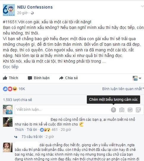 Câu chuyện xoay quanh cuộc sống không mấy suôn sẻ của một cô gái tự cho mình xấu được đăng tải trên fanpage NEU Confessions khiến cộng đồng mạng gật gù đồng ý.