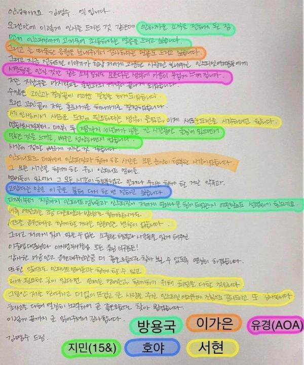Trong bức ảnh được cư dân mạng Hàn Quốc truyền tay nhau, những dòng được tô màu xanh bạc hà được cho là "đạo văn" từ bức thư của Bang Yong Guk (B.A.P). Tương tự như vậy, những dòng màu cam thuộc về Lee Ga Eun (After School), những dòng màu hồng là của Yoo Kyung (AOA), màu xanh lá cây của Jimin (15&), màu xanh dương của Hoya (INFINITE) và màu vàng thuộc về Seohyun (SNSD).
