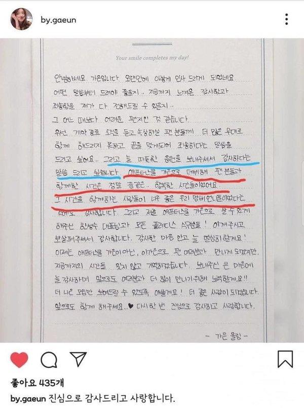 Lee Ga Eun: Ngoài ra, mình muốn cảm ơn mọi người vì đã cổ vũ cho mình thật nồng nhiệt. Khoảng thời gian mình đã trải qua cùng với người hâm mộ kể từ khi ra mắt với tư cách là Ga Eun của After School giống như một giấc mơ, và đó là một khoảng thời gian rất hạnh phúc.