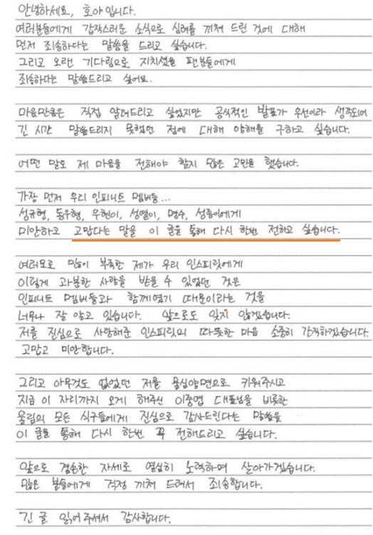 Ngoài ra, mình có thể tiếp tục với các thành viên INFINITE và mình sẽ cố gắng hết sức để ở bên cạnh các thành viên bất cứ nơi nào và bất cứ khi nào họ cần đến mình.