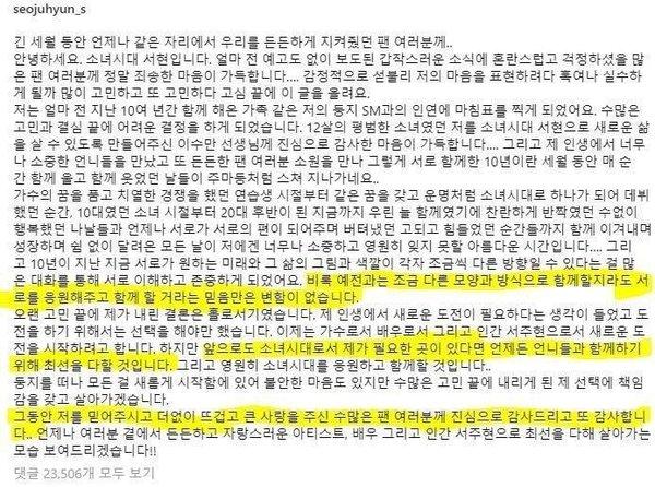 Seohyun: Mặc dù chúng mình sẽ đi theo những hướng khác nhau, nhưng chúng mình vẫn sẽ luôn cổ vũ cho nhau và suy nghĩ này sẽ không bao giờ thay đổi. Kể từ bây giờ, nếu SNSD có bất kỳ vị trí nào cần đến mình, mình sẽ cố gắng hết sức để được ở cùng với các unnie của mình. Cảm ơn những người hâm mộ của mình một lần nữa vì đã tin tưởng mình và trao cho mình một tình yêu to lớn hơn tất cả. Mình xin chân thành cảm ơn và cảm ơn các bạn một lần nữa..