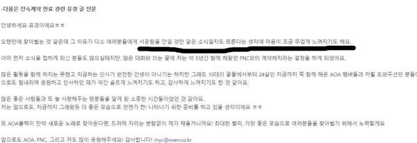 Ngoài ra, gửi đến chủ tịch Lee Jung Yeop, phó chủ tịch Lee Ji Young, và tất cả các thành viên trong gia đình Woollim đã giúp mình có những khoảng thời gian thật hạnh phúc và khó quên, nhiều như những gì họ đã ủng hộ mình, mình sẽ làm việc thật chăm chỉ với một trái tim biết ơn chân thành để có thể chào đón người hâm mộ sau khi cải thiện bản thân nhiều hơn nữa.