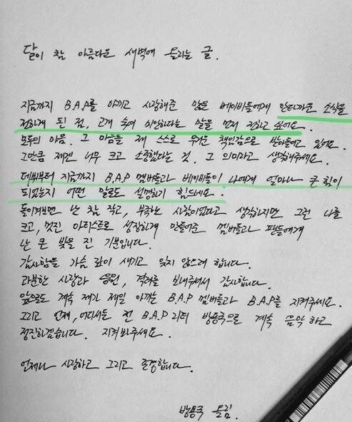 Bang Yong Guk: Mình muốn cúi đầu xin lỗi vì phải công bố một tin tức đáng tiếc như vậy. Thật khó để mình có thể diễn tả hết được sức mạnh mà các thành viên B.A.P và các BABY đã trao cho mình kể từ khi ra mắt cho đến tận bây giờ.
