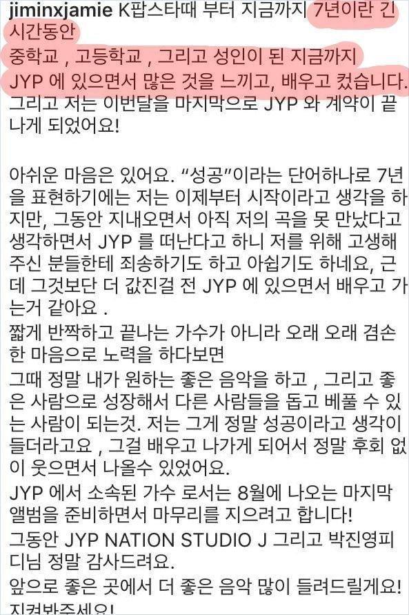Jimin: Trong suốt 7 năm dài này, từ trung học cơ sở, trung học phổ thông và cho đến bây giờ khi mình đã trở thành người lớn, mình đã được cảm nhận, đã được học hỏi và trưởng thành hơn rất nhiều khi gắn bó cùng JYP.