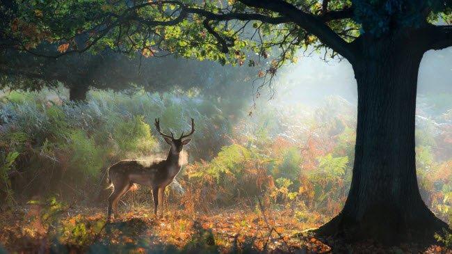 Hươu đực đứng dưới nắng sớm mùa thu khi lá cây chuyển màu vàng và bắt