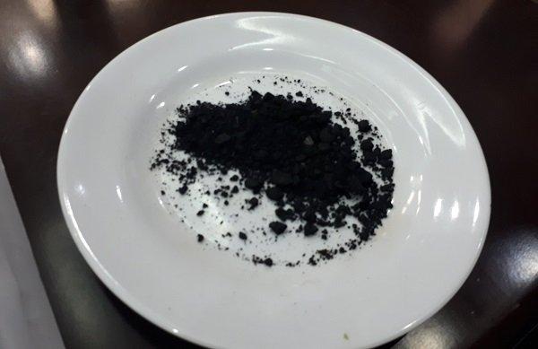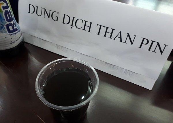 Mẫu bột pin và hỗn hợp nước pin cơ sở bà Loan dùng ngâm vỏ cà phê, sỏi