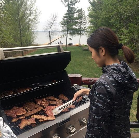 Giữa không gian thiên nhiên, Hà Tăng đã trổ tài nấu nướng để gia đình có một bữa tiệc vui vẻ bên nhau.