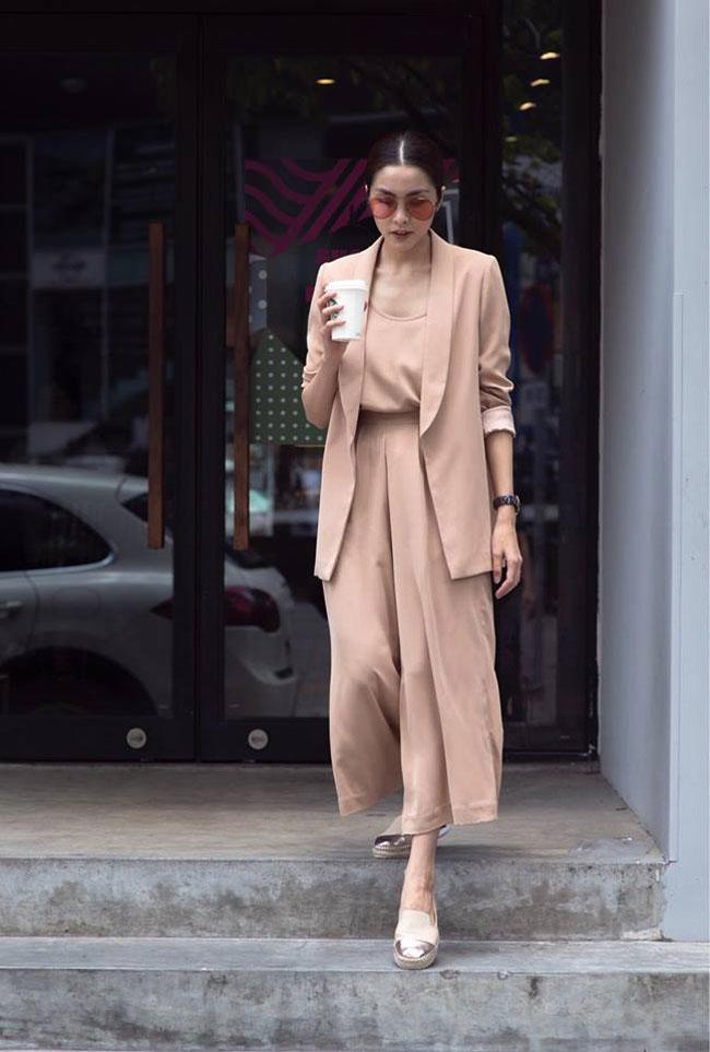 Nếu như trước đây, các tín đồ thường tìm đến set monochrome màu đen hoặc trắng để cho an toàn và thanh lịch thì giờ đây họ mạnh dạn ướm thử những gam màu sáng hơn như hồng, tím, đỏ, xanh... Như sự lựa chọn của Tăng Thanh Hà là một gam màu nude vừa thanh lịch lại vừa rất ngọt ngào không hề cứng nhắc.
