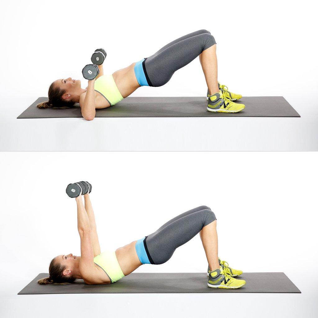 Với động tác này bạn chỉ cần đặt lưng trên thảm tập hoặc các nơi bằng phẳng, hai chân co góc 90 độ khép vào nhau. Hai tay giữ chấc tạ khoảng 2 kg, từ từ nâng lên kèm theo hít thở sâu, hạ xuống thở ra. Lưu ý trong quá trình tập phải giữ và điều khiển nhịp thở thật đều, nếu không các động tác sẽ không có hiệu quả.