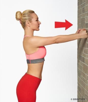 Đứng cách xa bức tường nửa mét, đưa tay ra trước mặt và nắm thành nắm đấm rồi ấn vào bờ tường. Bạn sẽ cảm thấy cơ ngực của bạn đang hoạt động. Thực hiện trong 20 giây, sau đó nghỉ ngơi trong 10 giây, lặp lại 3 lần.