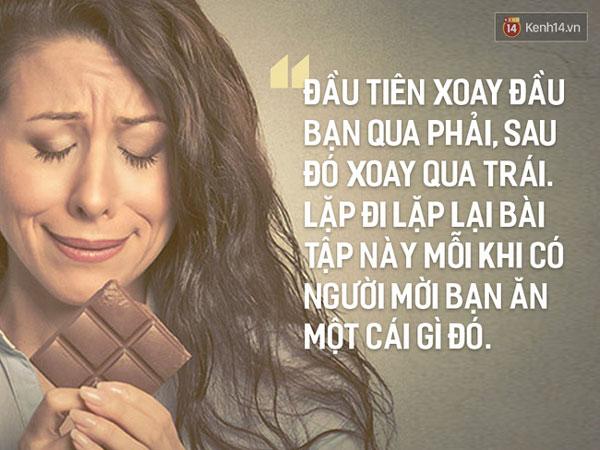 1. Bí quyết giảm cân: Đầu tiên xoay đầu bạn qua phải, sau đó xoay qua trái. Lặp đi lặp lại bài tập này mỗi khi có người mời bạn ăn một cái gì đó.