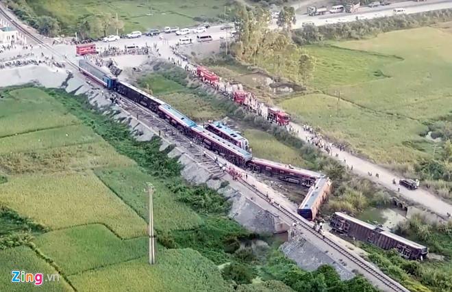 Hiện trường vụ lật tàu khiến 2 người chết nhìn từ trên cao: 8 toa tàu bị lật trong đêm sau cú đâm xe tải ở Thanh Hóa khiến 2 người chết cùng nhiều người bị thương.