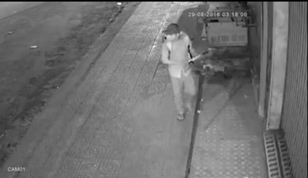 Kiểm tra camera an ninh, anh Thiện phát hiện tên trộm đội mũ lưỡi trai, đeo kính và khẩu trang. Kẻ trộm quan sát xung quanh một lúc và thử mở cửa bằng thiết bị khác nhưng không được nên mới dùng đến kìm cộng lực.