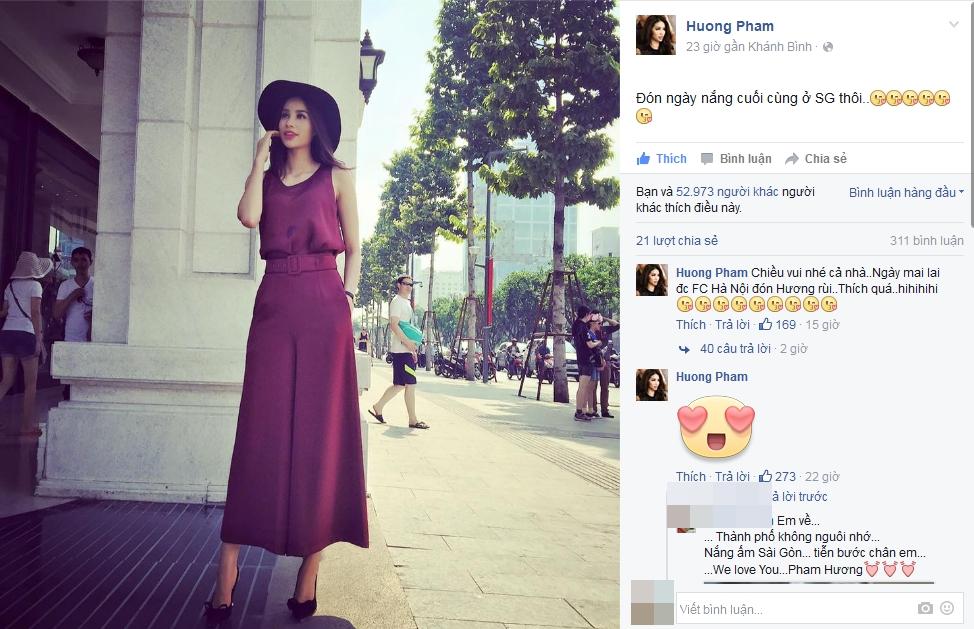 Dòng chia sẻ lững lờ bỏ ngỏ của Phạm Hương nhanh chóng thu hút sự chú ý quan tâm của giới mộ điệu. Ngoài những lượt like thể hiện sự thích thú về nhan sắc hình ảnh thì cũng có nhiều nghi vấn đặt ra cho rằng người đẹp Hoàn Vũ đang khéo nói "chia tay" với Sài Gòn để ra bắc.