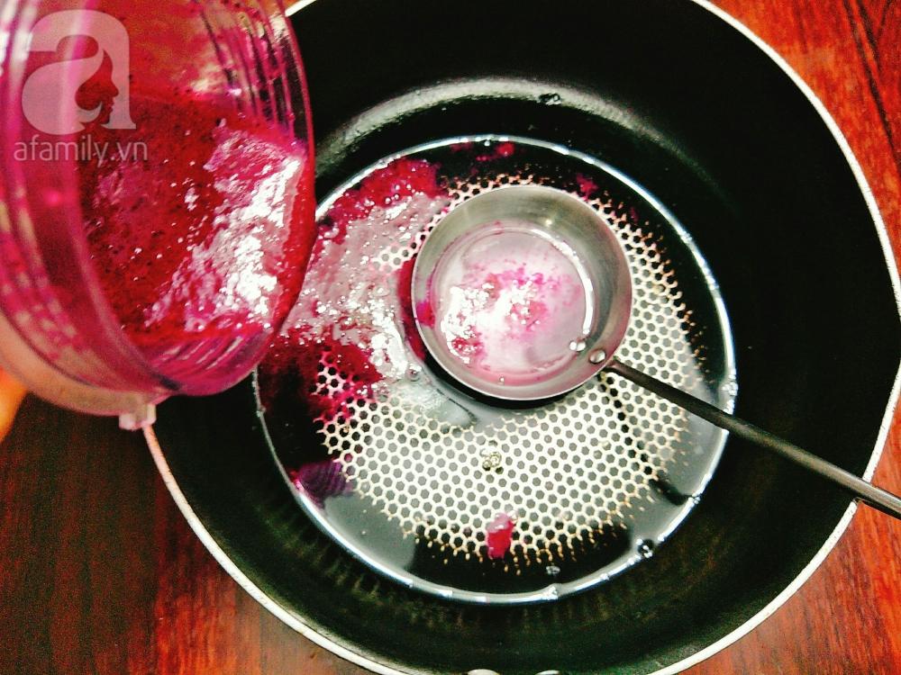 Bước 4: Để cho hỗn hợp nguội bớt thì đổ nước cốt thanh long vào khuấy đều, ta được phần thạch thanh long. Bạn múc 2 muôi thạch thanh long đổ vào cốc hoặc ly, ta được lớp thạch đầu tiên sau đó đem cất ngăn mát tủ lạnh khoảng 1 tiếng cho thạch đông lại rồi mới tiến hành làm phần thạch sữa chua nhé.
