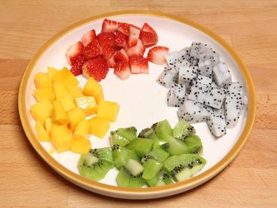 Chuẩn bị hoa quả: xoài, kiwi, thanh long và dâu tây thái hạt lựu.