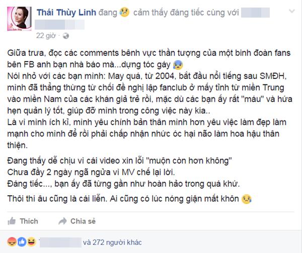 "Những ai là fan chân chính hoặc fan có suy nghĩ, có học hành, những fan có độ chín chắn nhất định, các trưởng FC hoặc người quản lý fan của Mỹ Tâm, hãy họp bàn lại và đưa ra phương án chấn chỉnh lại đội ngũ fan non dại nói trên. Hãy để hình ảnh của Mỹ Tâm đẹp gắn liền với FC đẹp như nhiều năm qua các bạn đã gây dựng và giữ gìn. Sai thì nhận, thần tượng hay bố mẹ, ai cũng có lúc sai nên chẳng có gì phải giãy nảy lên cãi vã chửi bới làm gì. Thiết nghĩ đó là cách hành xử văn minh và công bằng", Thái Thùy Linh mong mỏi.