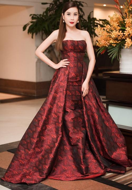 Lưu Hương Giang khoe vóc dáng thon gọn với mẫu đầm xòe quét đất màu đỏ mận. Tuy nhiên lối trang điểm tượng sáp khiến thần thái người đẹp không còn quyến rũ.
