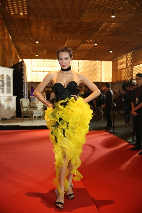 Phương Mai tiếp tục đi theo "vết xe đổ" của các người đẹp khác khi tham lam điểm nhấn trên váy. Với một thiết kế cúp ngực sexy sắc đen như thế này, phần bèo nhún to xù màu vàng chóe có vẻ không phải là sự kết hợp ăn ý.