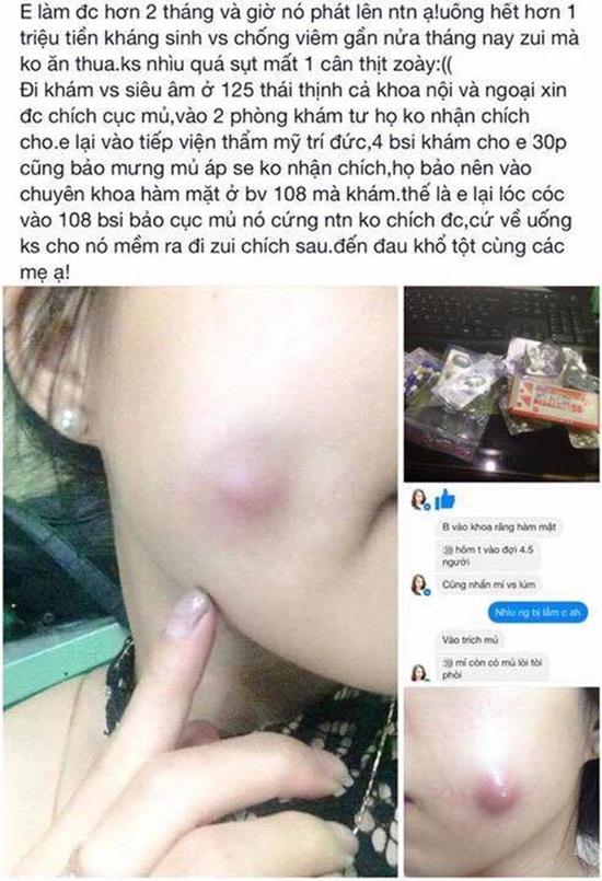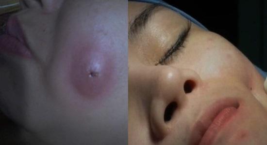 Cô gái này còn chia sẻ, vừa thực hiện nhấn má lúm 2 tháng trước và hiện tại thì hai bên má ngay chỗ nhấn má lúm sưng khá to, có cảm giác có mủ bên trong. Dùng ngón tay động vào khá đau rát. Sau khi xuất hiện những biến chứng này, cô đã phải đi khám ở rất nhiều bệnh viện và uống thuốc điều trị nhưng vẫn chưa có dấu hiện thuyên giảm.