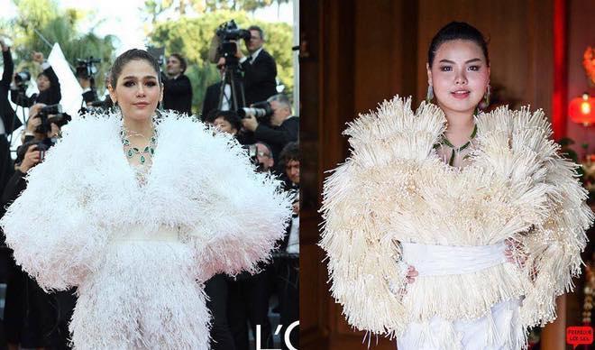 Nhìn thoáng qua thì hai thiết kế này giống nhau đến 70%, mặc dù bộ đầm fake được chế tác từ phồng tôm