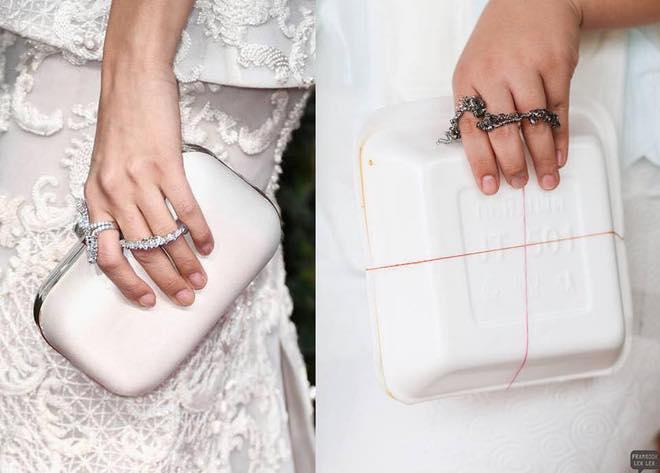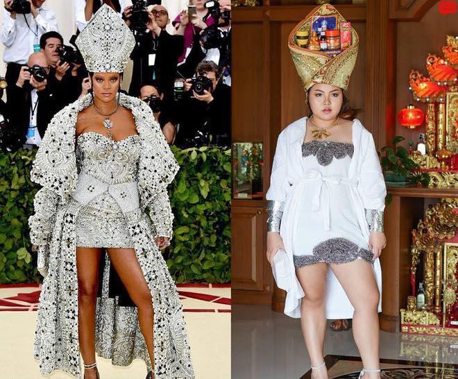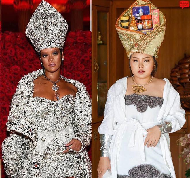 Rihanna cũng chịu chung ảnh ngộ. Bộ cánh đính đá tỉ mỉ, đi kèm áo khoác dáng dài của nhà mốt Maison Margiela quyền lực bao nhiêu thì nhìn sang thiết kế tự chế của cô nàng lại bi hài bấy nhiêu.
