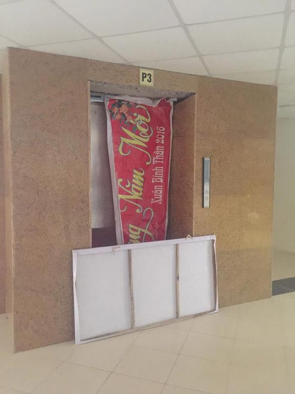 Thang máy sau khi gặp sự cố đã che chắn chờ sửa chữa.